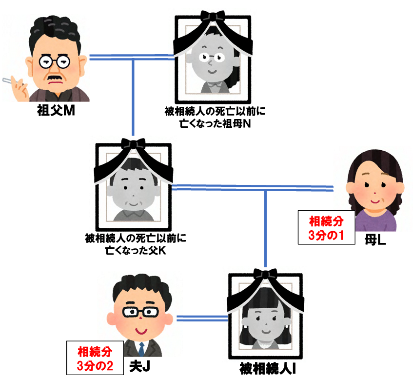 Iの両親のうち父Kは、Iが死亡する以前に亡くなっており、母Lは健在です。