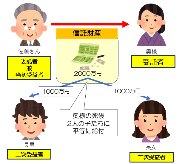 そこで、佐藤さんは家族信託を活用することにしました。信託契約によって、2000万円を信託財産とし、受託者である妻に財産の管理を委託します。そして、妻が亡くなった後は、子供たちが平等に財産を受け取るように設定します。